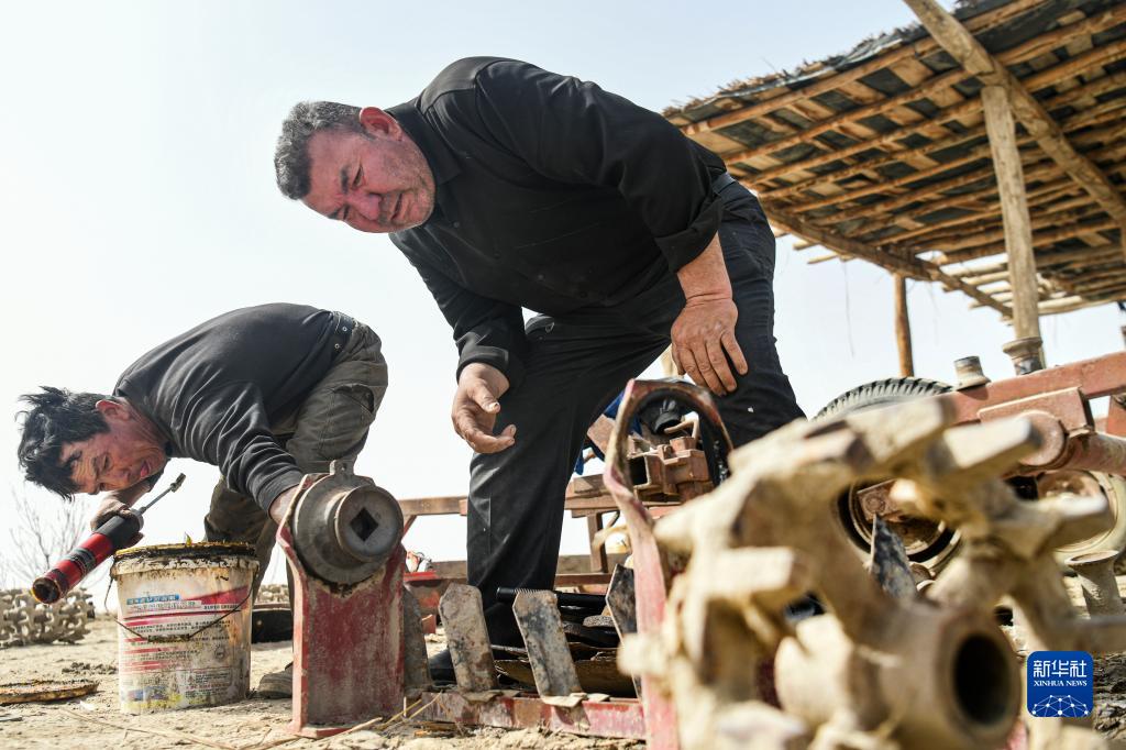 在新疆尉犁縣,棉農(nóng)爾肯·熱依木(右)檢修農(nóng)機(jī)準(zhǔn)備春播(3月29日攝)。