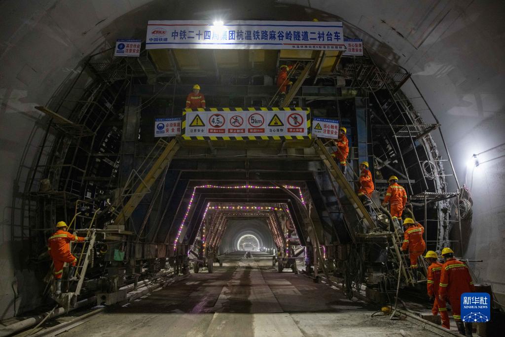4月3日,中鐵二十四局的工人登上杭溫鐵路麻谷嶺隧道二襯臺車進行施工作業。當日凌晨,麻谷嶺隧道全線貫通。