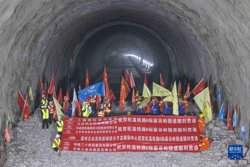 4月3日,建設者慶祝杭溫鐵路麻谷嶺隧道貫通。