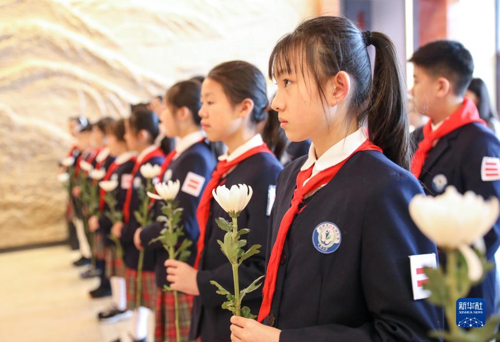 4月3日,合肥市六安路小學翠微分校的少先隊員代表在蜀山烈士陵園緬懷先烈。