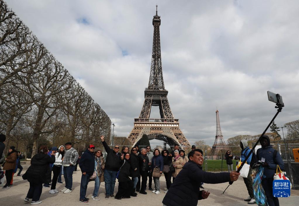4月3日,游客在法國(guó)巴黎埃菲爾鐵塔附近拍照留念。