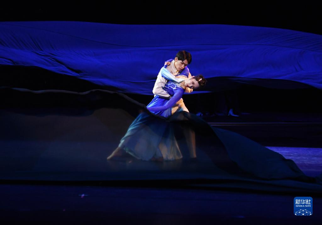 4月3日,演員在舞劇《藍色裙擺》中表演。