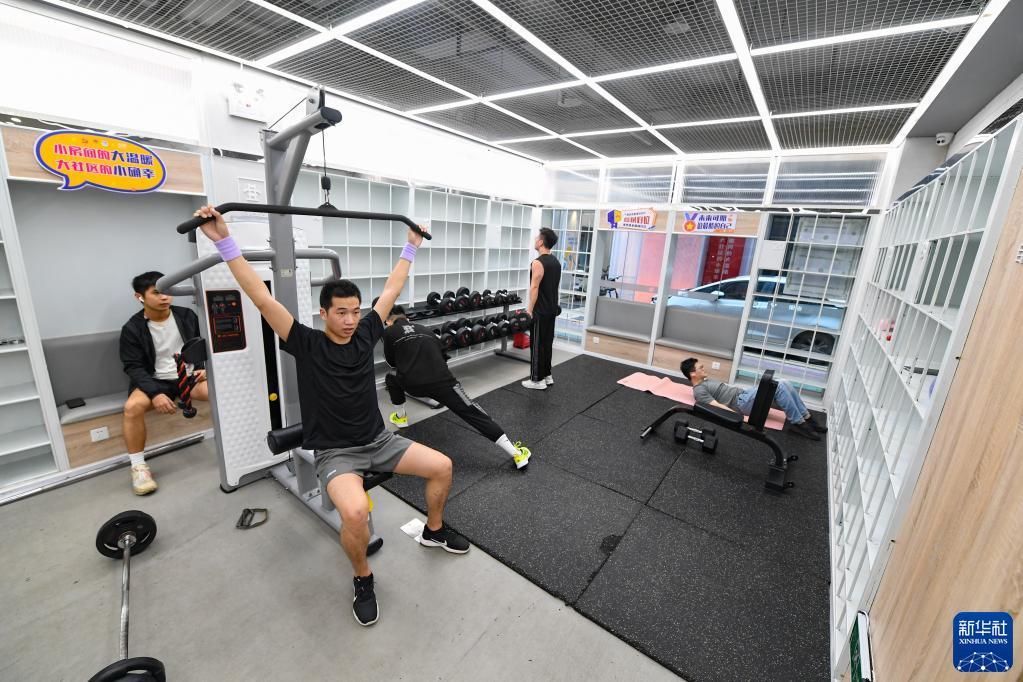 4月2日,在深圳市龍華區(qū)元芬村,青年公寓住戶在社區(qū)增設(shè)的健身房鍛煉。