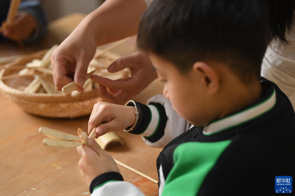 4月3日,前來研學的小學生在姜鵬的工作室制作竹蜻蜓。新華社記者 翁忻旸 攝