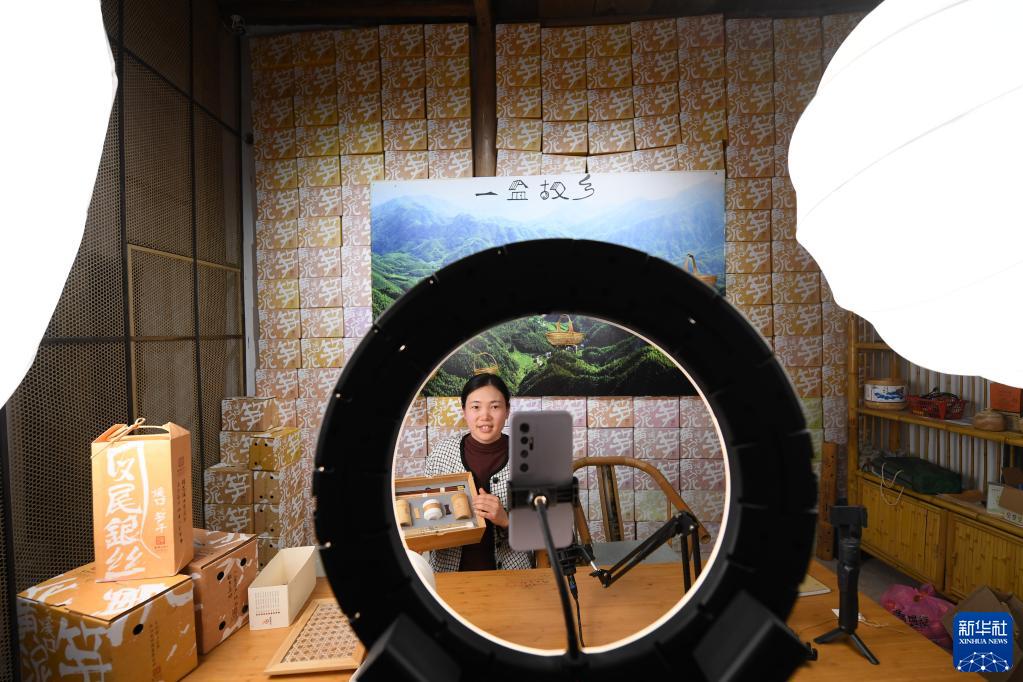 4月3日,鄒霞在直播間介紹一款由當地黃茶、紅木筷子、皮紙和手工竹編結合的產品。新華社記者 翁忻旸 攝