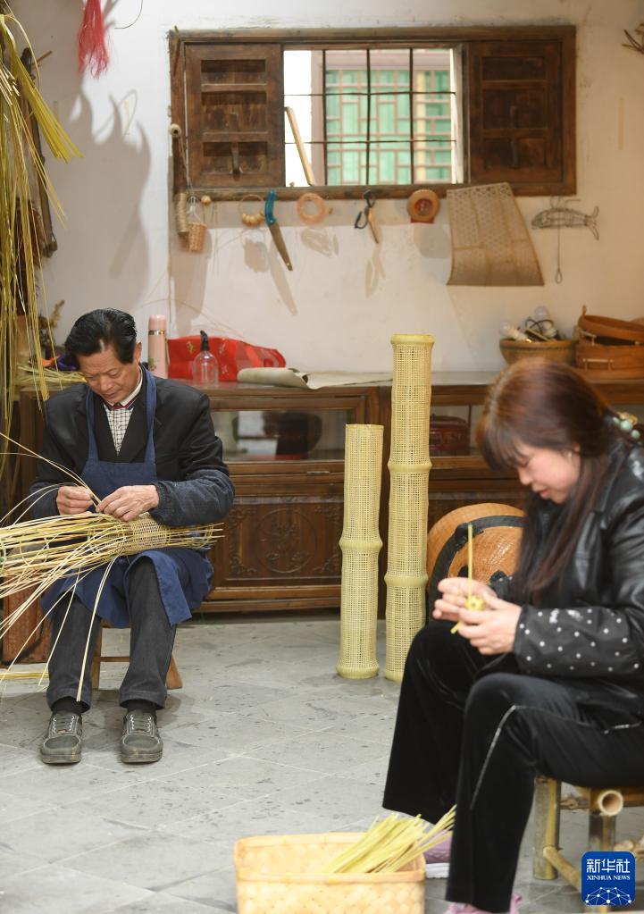 4月3日,村里的篾匠和農戶在姜鵬的工作室里編制竹制品。新華社記者 翁忻旸 攝