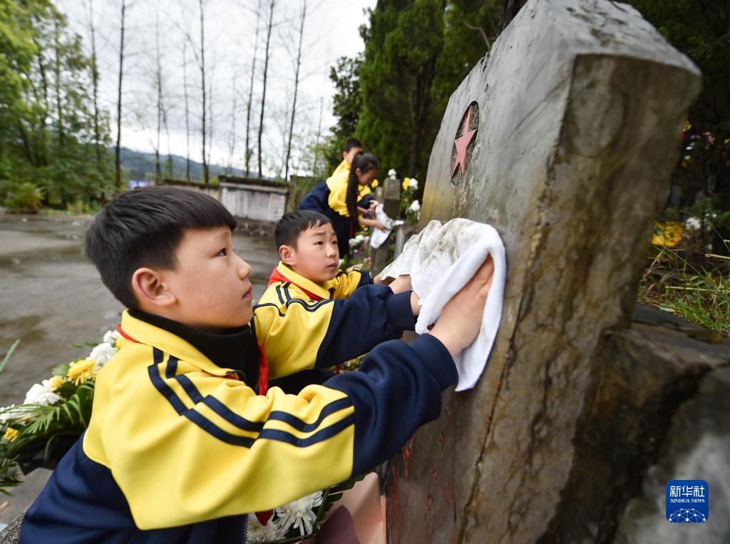 4月4日,貴州省銅仁市松桃苗族自治縣實驗小學的學生在烈士陵園擦拭烈士墓碑。