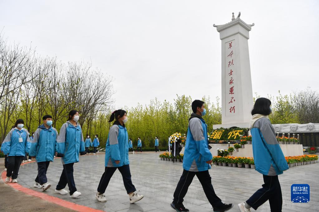 4月4日,在陜西省興平市烈士陵園,興平市秦嶺中學學生繞烈士紀念碑一周,緬懷英烈。