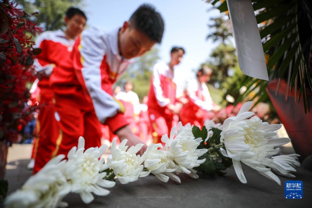 4月4日,學生在貴州省畢節市烈士陵園敬獻鮮花。