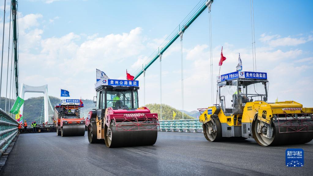 在金烽烏江大橋,貴州公路集團工人駕駛攤鋪機進行橋面鋪裝施工(4月3日攝)。