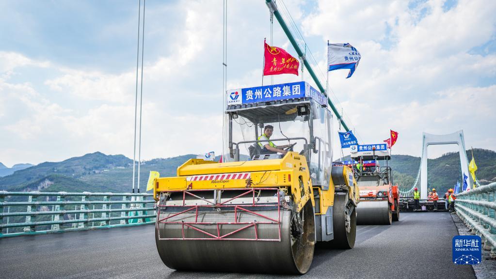 在金烽烏江大橋,貴州公路集團工人駕駛攤鋪機進行橋面鋪裝施工(4月3日攝)。