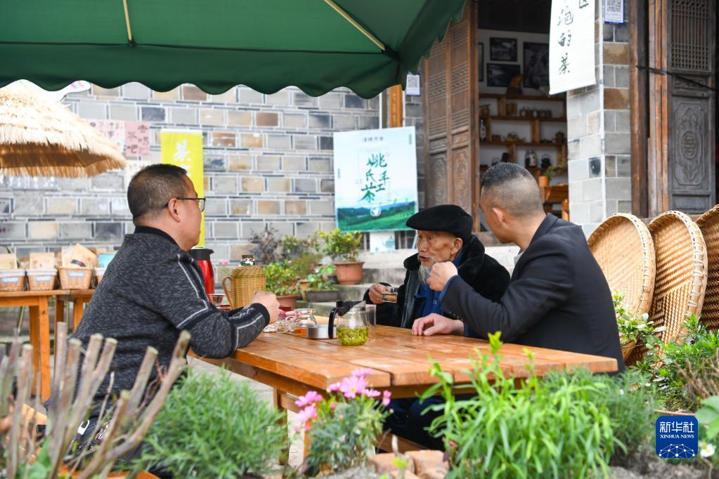 4月4日,在四川省汶川縣水磨鎮禪壽老街,游客在一家茶鋪前品茶。