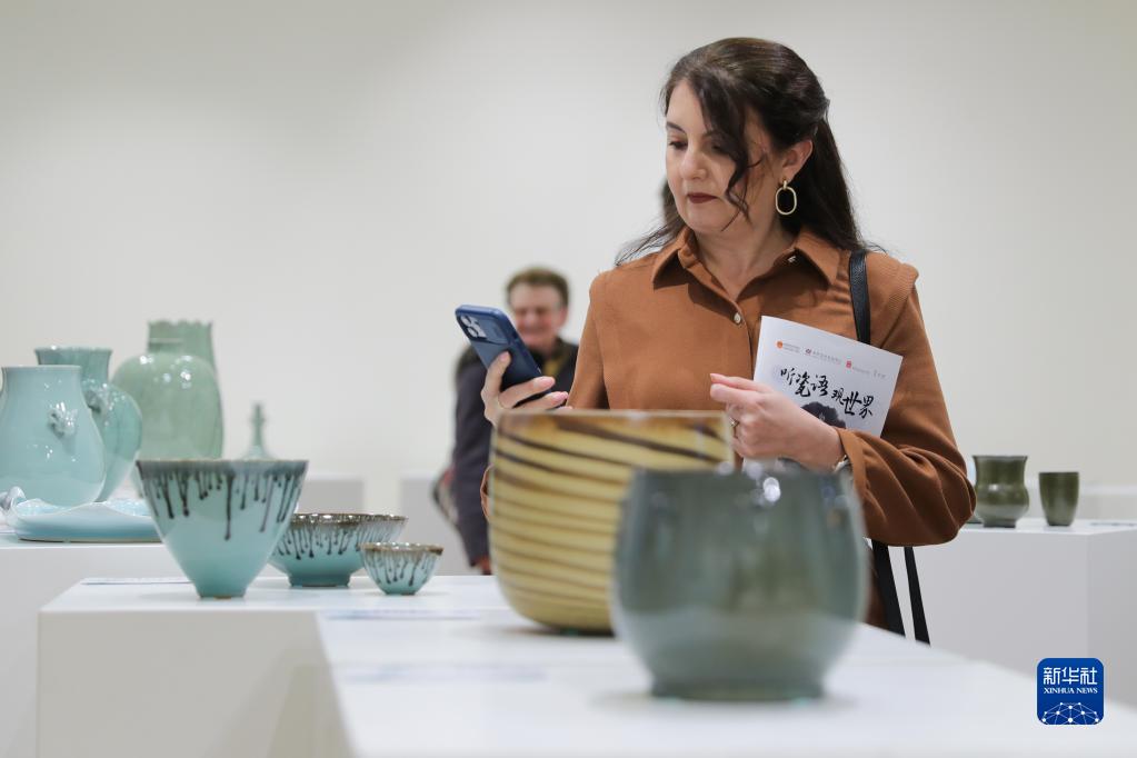 4月3日,在比利時布魯塞爾,參觀者在“聽瓷語 觀世界——宋韻龍泉青瓷展”上觀賞瓷器。