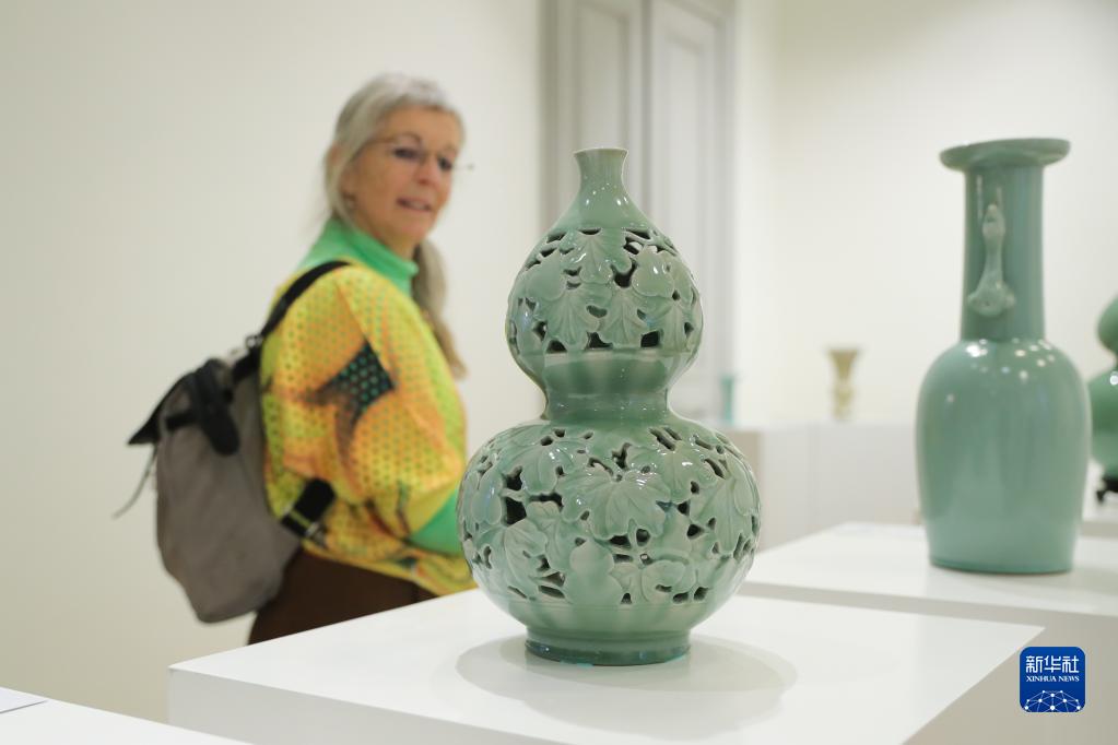 4月3日,在比利時布魯塞爾,參觀者在“聽瓷語 觀世界——宋韻龍泉青瓷展”上觀賞瓷器。