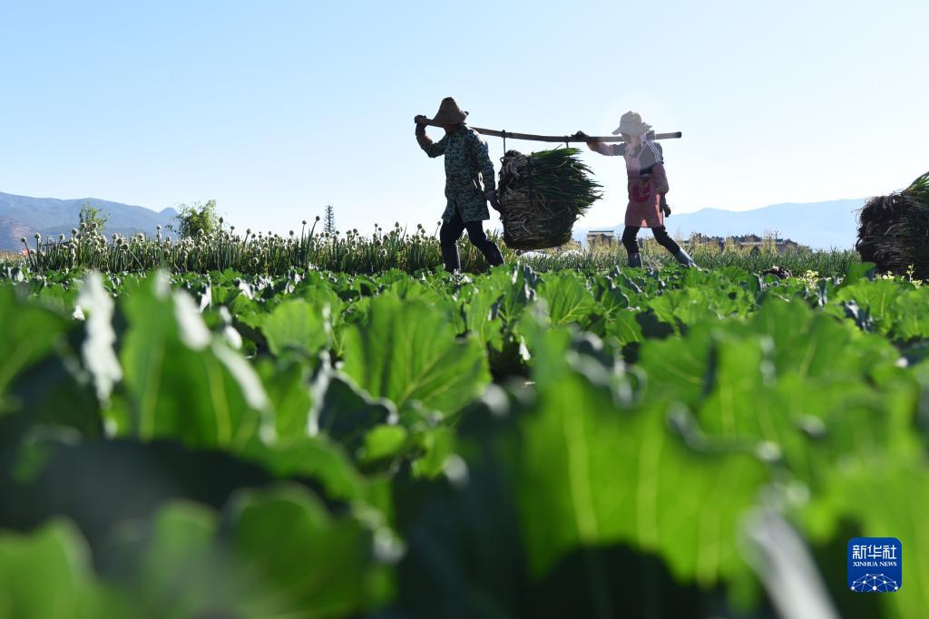 4月4日,農(nóng)民在云南省麗江市玉龍納西族自治縣黃山街道的農(nóng)田里搬運蔬菜。