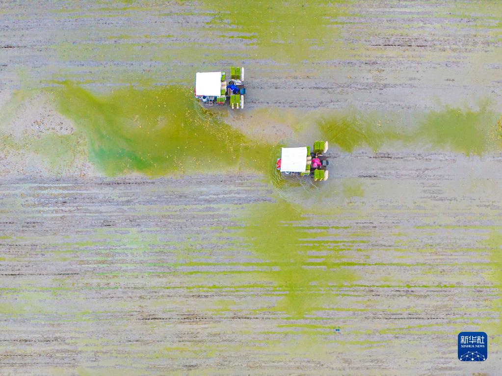 4月4日,浙江省溫嶺市城南鎮農民駕駛插秧機在田間作業(無人機照片)。