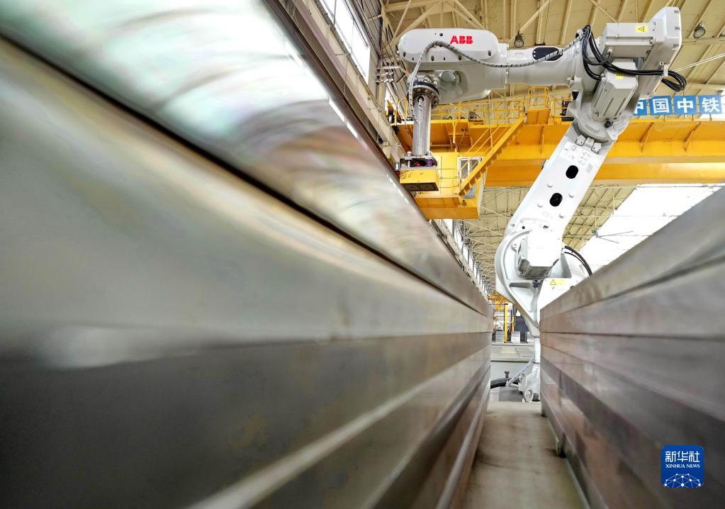4月4日,秦皇島市山海關區中鐵山橋集團有限公司高速道岔墊板生產線上的機器人在工作中。