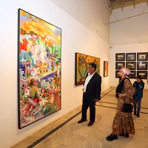4月3日,人們在埃及首都開羅參觀“藝匯絲路——中阿知名藝術家采風作品展”。