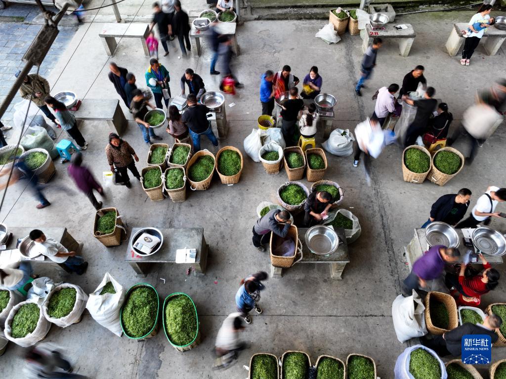 4月4日,茶商在遵義市湄潭縣湄江茶青交易市場內收購茶青(無人機照片)。