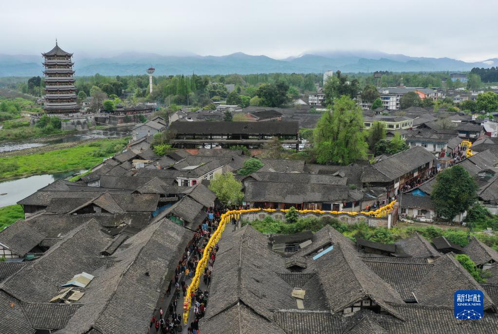 當日,崇州元通清明春臺會在四川成都崇州市元通古鎮拉開帷幕。由269人手舉269截龍身匯聚成的“匯江老龍”,在古街上巡游。