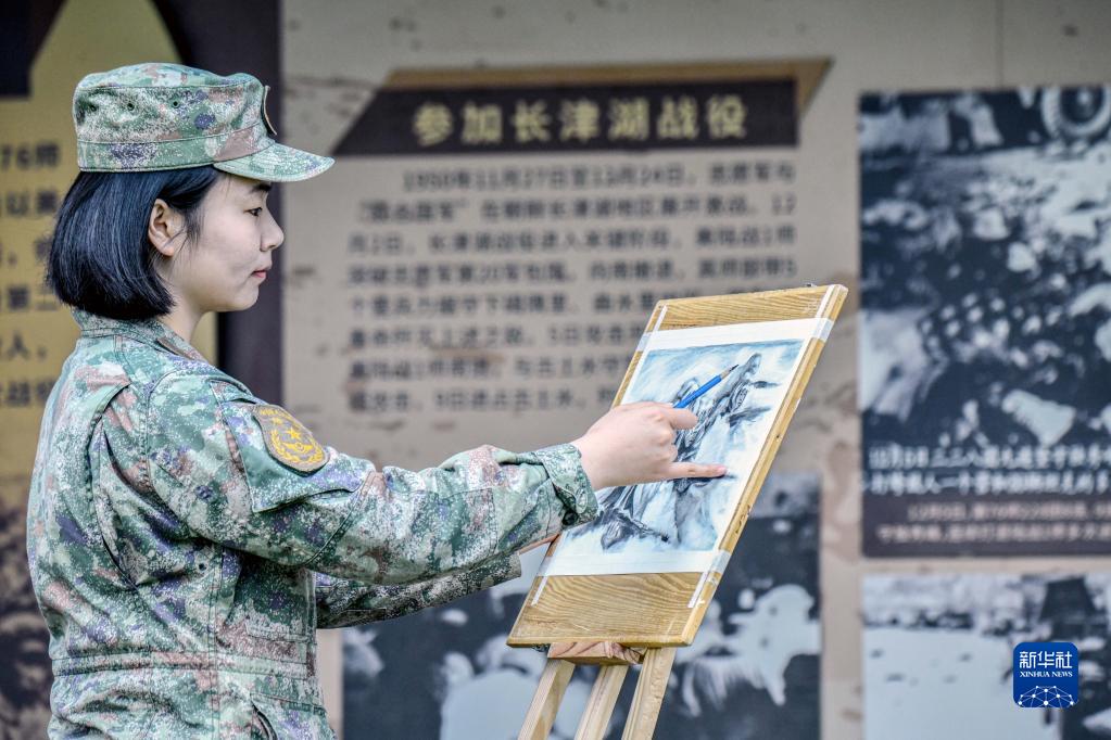 4月4日,第73集團軍某旅組織官兵開展“寸紙追思”活動,通過素描革命先輩雕塑和畫像的形式感悟英烈精神。這是一名女兵在旅史長廊畫素描。