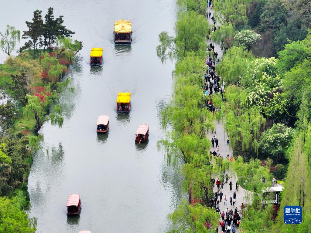 4月5日,游客在江蘇揚州瘦西湖風景區游玩(無人機照片)。
