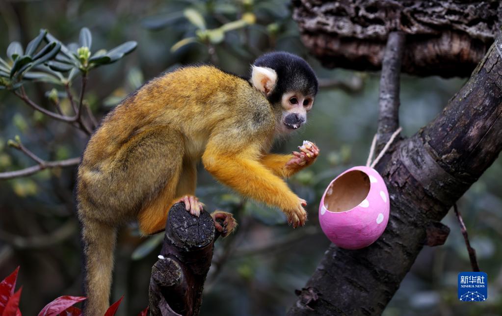 4月5日,在英國倫敦動物園,一只松鼠猴享用“彩蛋大餐”。