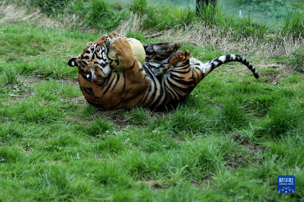 4月5日,在英國倫敦動物園,一只蘇門答臘虎享用“彩蛋大餐”。