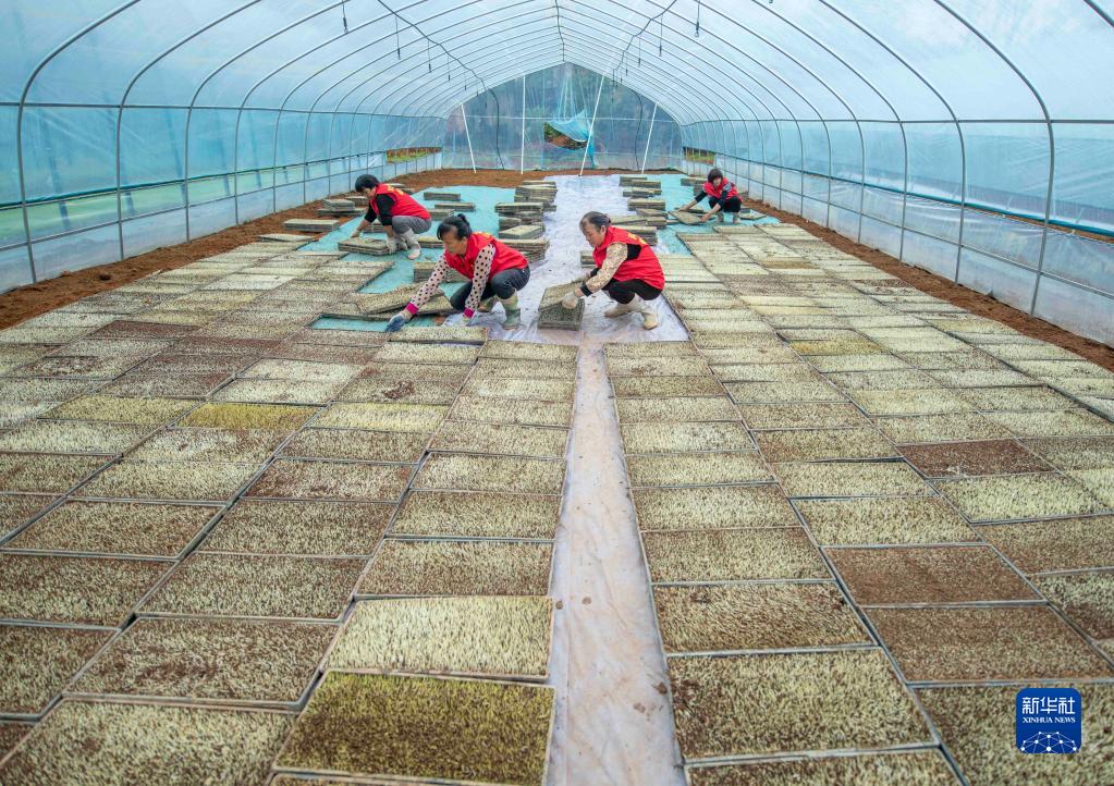 4月5日,在湖南省永州市道縣上關(guān)街道向陽村,農(nóng)民在和豐農(nóng)機專業(yè)合作社育秧基地擺放秧盤。