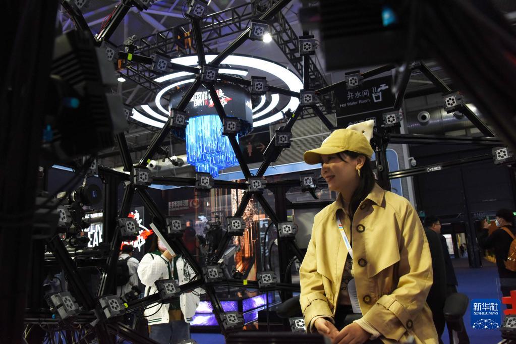 4月6日,參觀者在展會上體驗數字微表情捕捉技術。