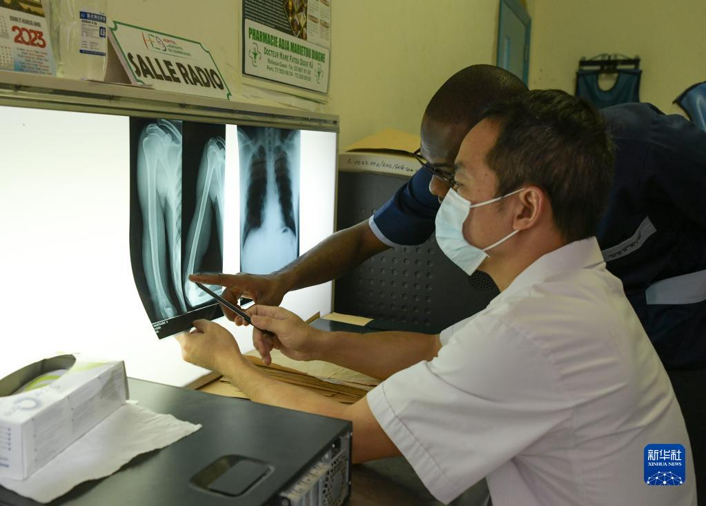3月21日,在塞內(nèi)加爾迪亞姆尼亞久兒童醫(yī)院,中國(guó)第19批援塞內(nèi)加爾醫(yī)療隊(duì)影像科醫(yī)生江文匡與當(dāng)?shù)蒯t(yī)生一起查看患者的影像檢查結(jié)果。