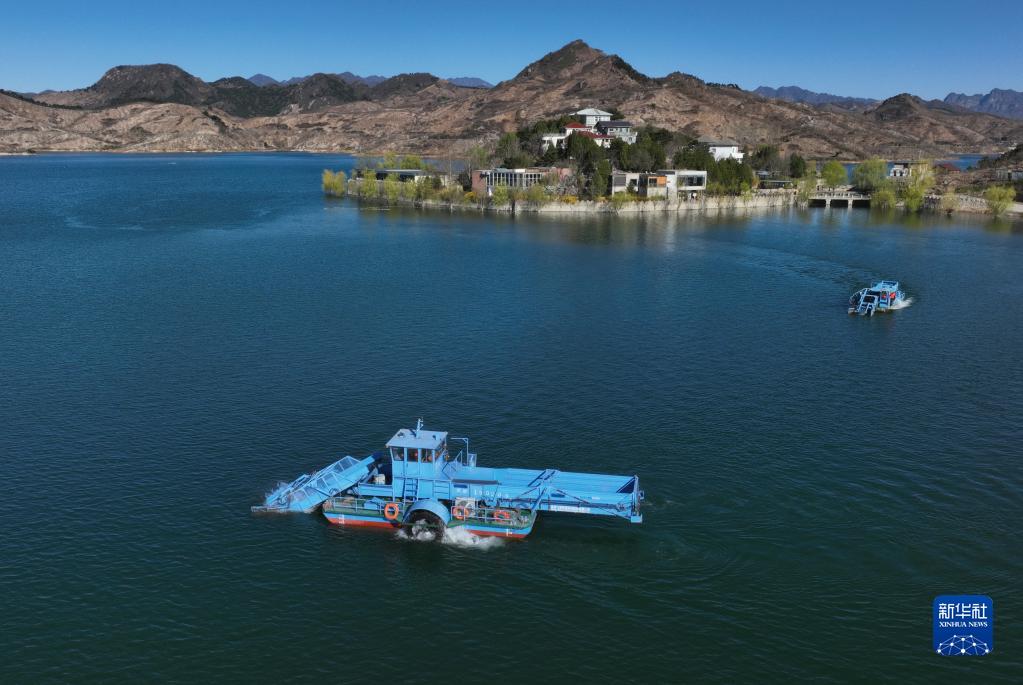 4月7日,河北省遵化市上關湖管理部門的工人操作專業打撈船在湖面上作業(無人機照片)。