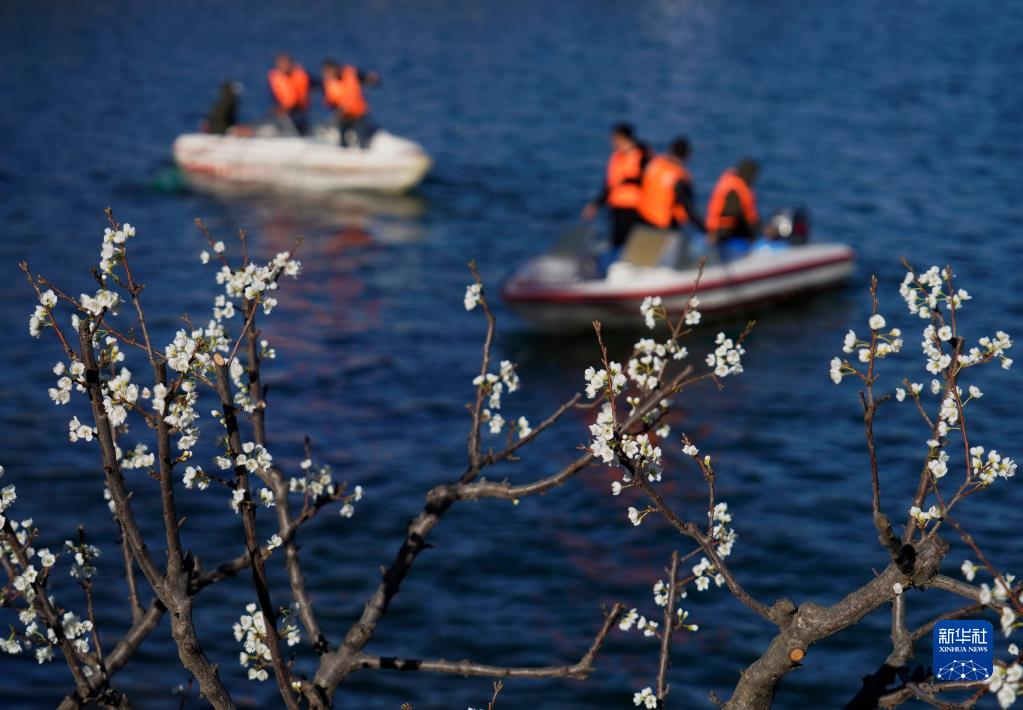 4月7日,河北省遵化市上關(guān)湖管理部門的工人在打撈湖面漂浮物。