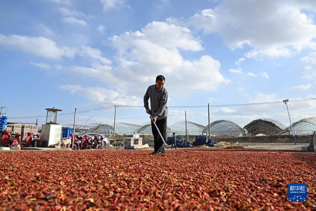 4月6日,在天津市薊州區(qū)下?tīng)I(yíng)鎮(zhèn)野森家庭農(nóng)場(chǎng),工人整理晾曬的山楂干。
