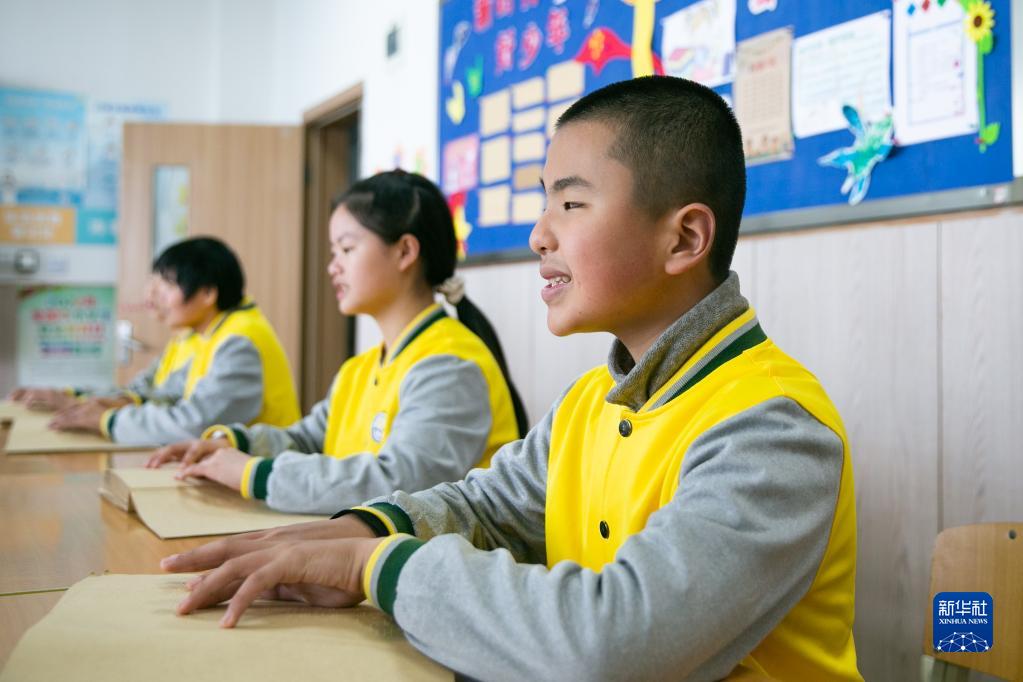 3月31日,重慶市特殊教育中心的視力障礙學生在教室內朗讀古詩。