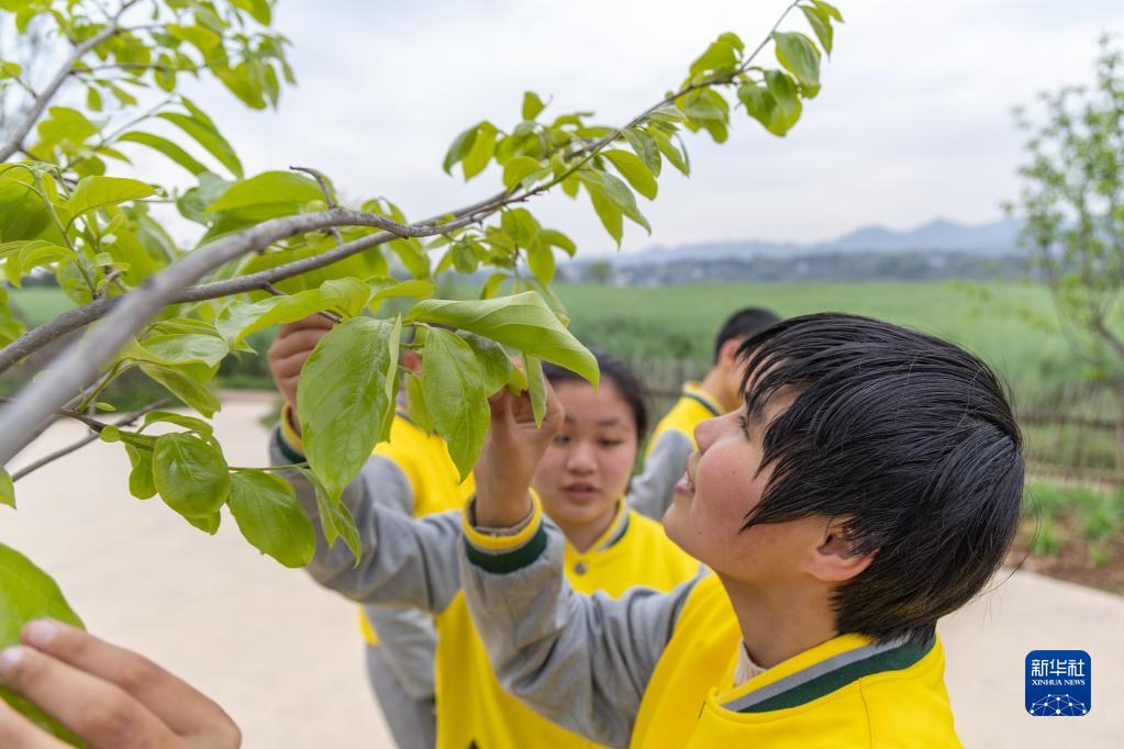 3月31日,在重慶廣陽島,重慶市特殊教育中心的視力障礙學生輕輕觸摸植物綠葉,感受春的氣息。