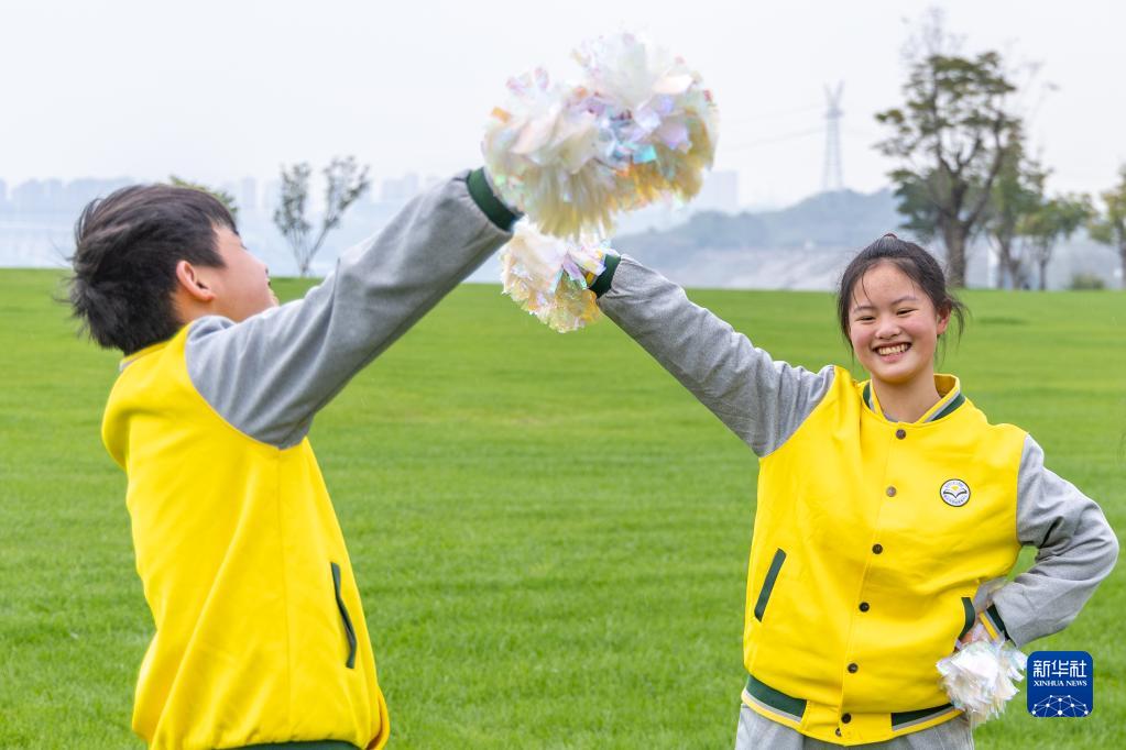 3月31日,在重慶廣陽島,重慶市特殊教育中心的視力障礙學生在草坪上跳操。