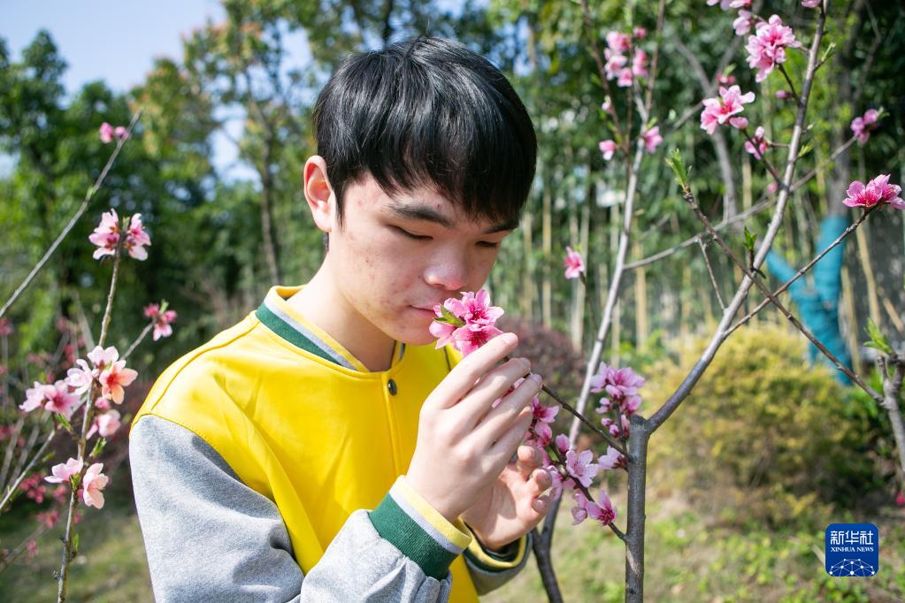 3月14日,重慶市特殊教育中心的視力障礙學生在校園內輕輕觸摸花朵、聞花香。
