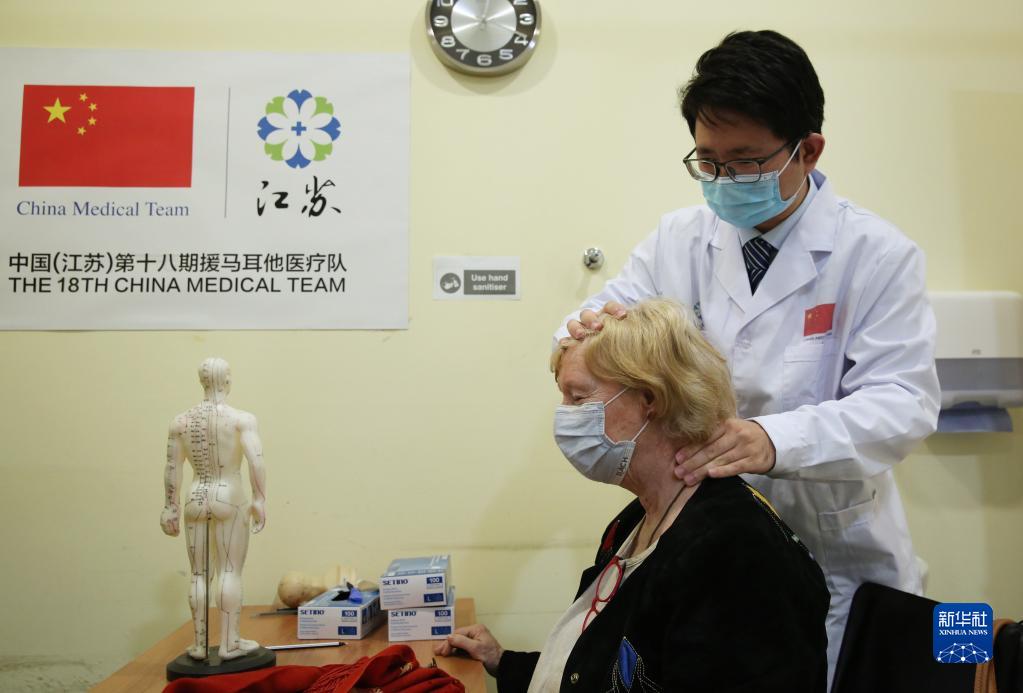 4月5日,在馬耳他保拉市地中海地區中醫中心,中國第18期援馬耳他醫療隊成員為一名女士進行推拿治療。