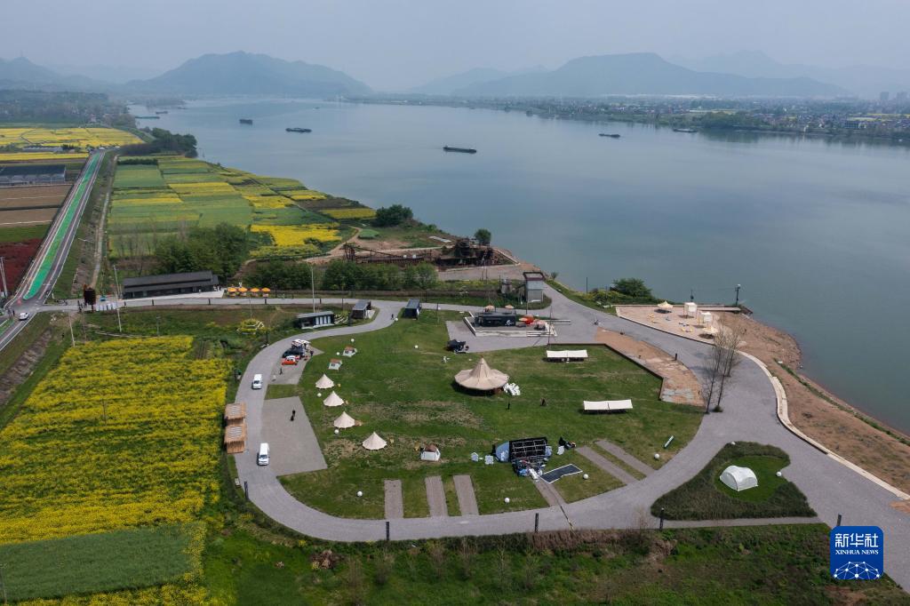 這是富春江畔的新桐鄉(xiāng)“山居鹿境”露營基地(4月7日攝,無人機照片)。