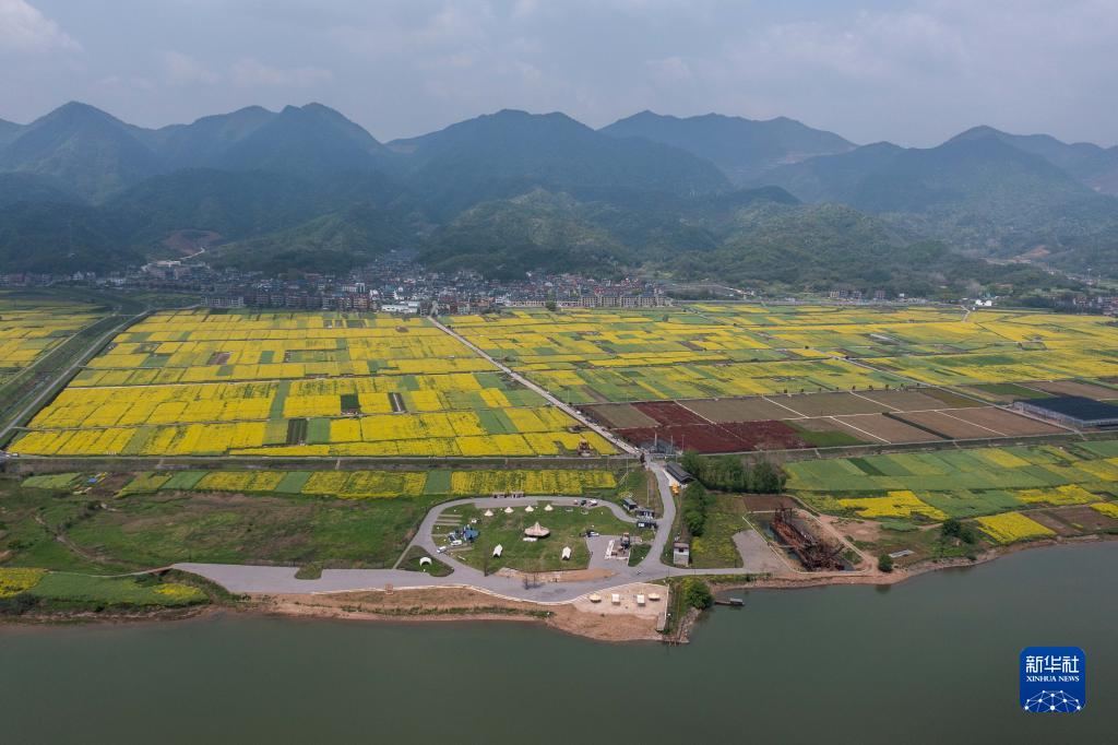 4月7日,富春江畔的新桐鄉(xiāng)“山居鹿境”露營(yíng)基地和近萬(wàn)畝油菜花田構(gòu)成了春日美景(無(wú)人機(jī)照片)。