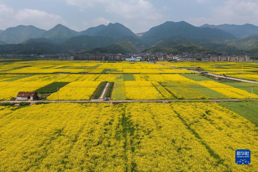 4月7日,空中俯瞰新桐鄉(xiāng)近萬畝盛開的油菜花田(無人機(jī)照片)。