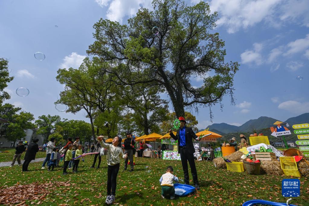 4月7日,小朋友們在新桐鄉小桐洲村香樟公園的“農夫市集”玩耍。