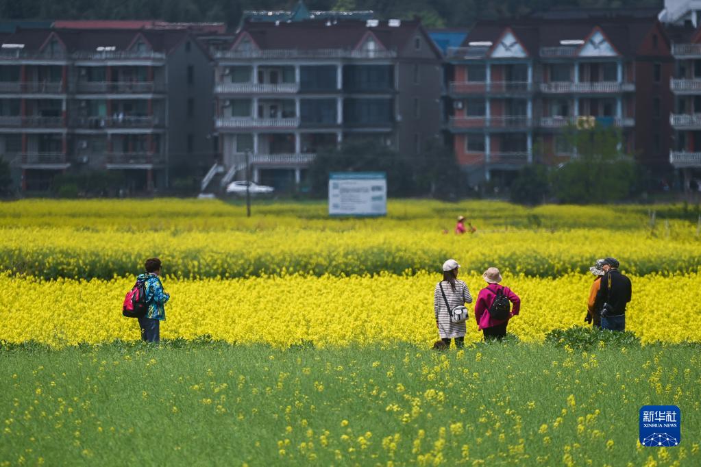 4月7日,游客在新桐鄉盛開的油菜花田里觀賞春色。