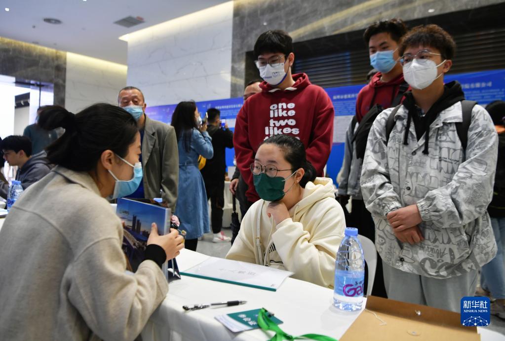 4月7日,在招聘會(huì)現(xiàn)場(chǎng),高校畢業(yè)生向用人單位人事負(fù)責(zé)人咨詢(xún)崗位情況。