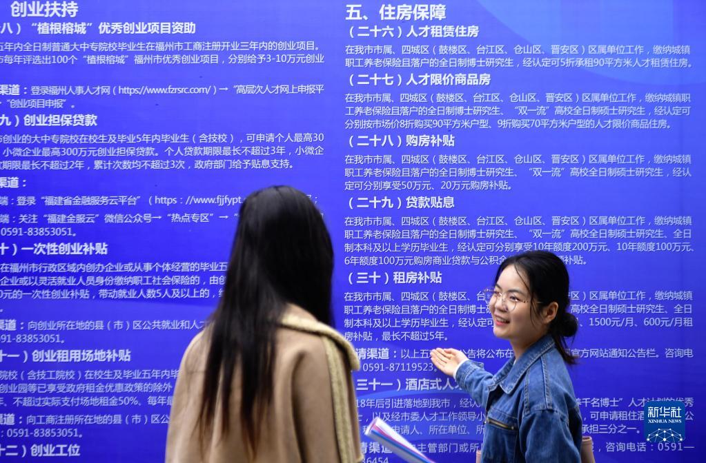 4月7日,高校畢業生在招聘會現場觀看高校畢業生來榕留榕就業創業優惠政策。