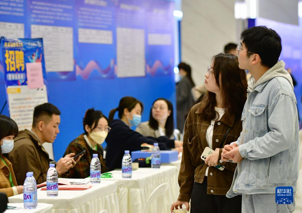 4月7日,高校畢業生在招聘會現場觀看求職信息。