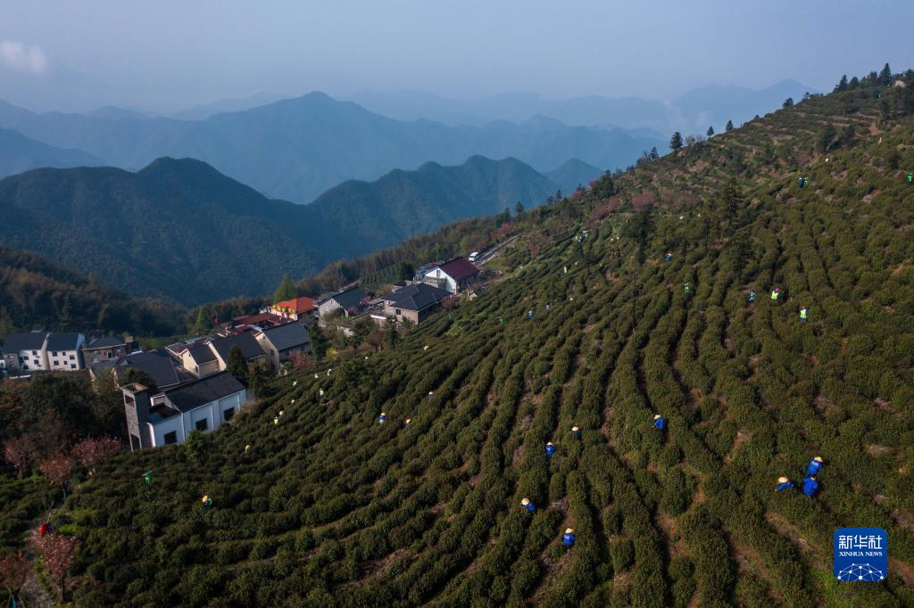 4月7日,安頂村的茶農在采摘安頂云霧茶(無人機照片)。