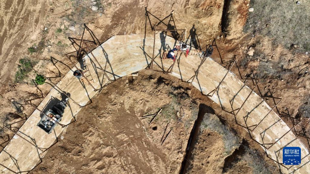 4月7日,在邢臺市信都區(qū)會寧鎮(zhèn)張爾莊村葫蘆生態(tài)種植園,村民在搭建葫蘆藤架(無人機照片)。