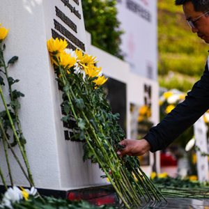 4月7日,參加活動(dòng)的志愿者在現(xiàn)場(chǎng)獻(xiàn)花。